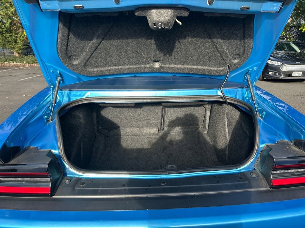 The Challenger R/T's striking exterior design is sure to turn heads wherever you go. The bold, muscular lines and distinctive Dodge styling cues, including the iconic split-grille and retro-inspired taillights, create a commanding presence on the road. The vibrant Blue exterior color further accentuates the Challenger's dynamic persona, while the modern hood stripe and trunklid spoiler add a touch of sporty flair.