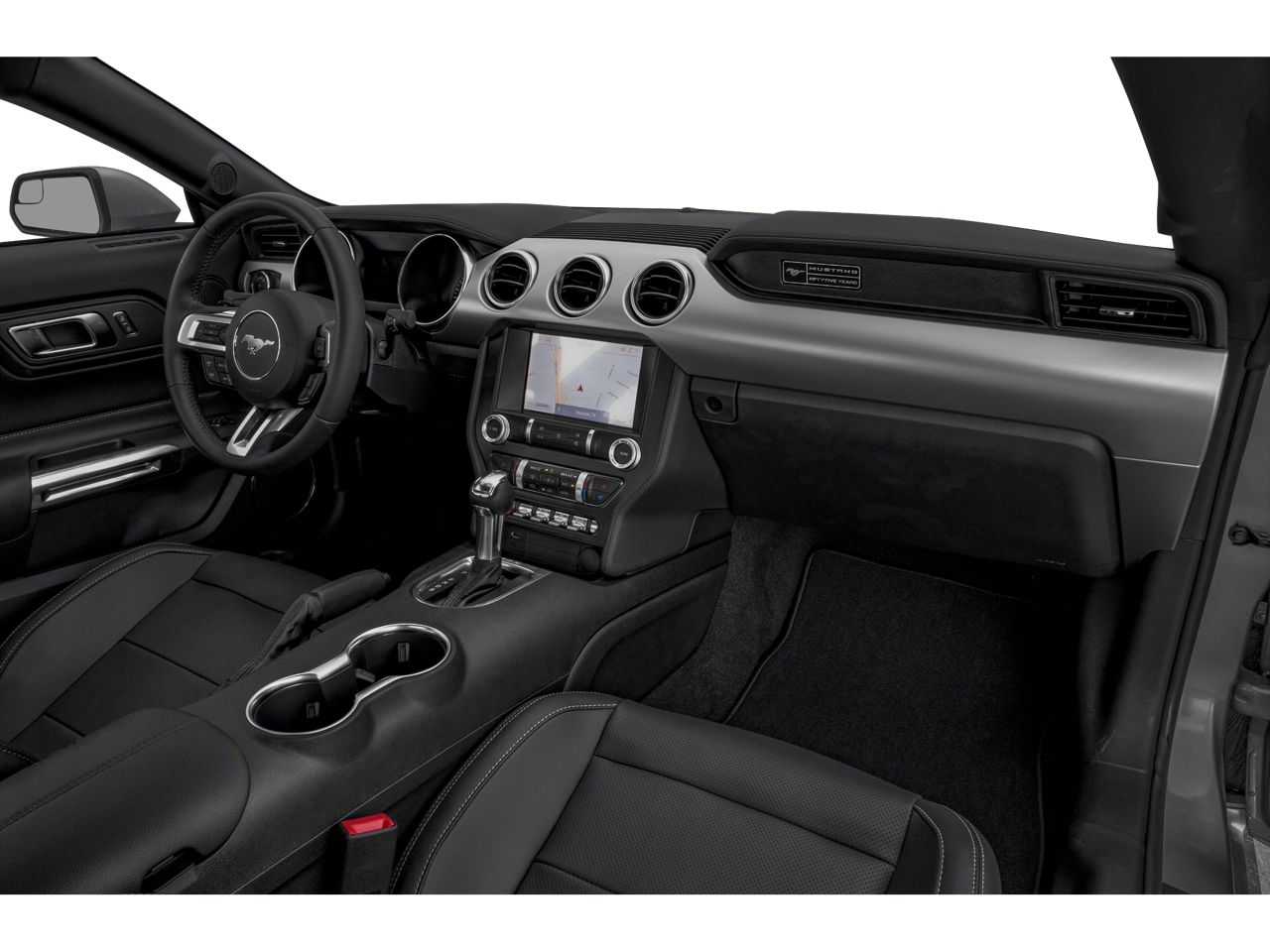 The California Special Package adds a distinctive flair to this Mustang, with features like the Unique Front Grilles with Offset Tri-Bar Pony Logo, the Pedestal Rear Spoiler, and the Miko Suede Door Inserts with Red Contrast Stitching. The Enhanced Security Package, meanwhile, offers added peace of mind with its electronic-locking center console and electronic steering column lock.
