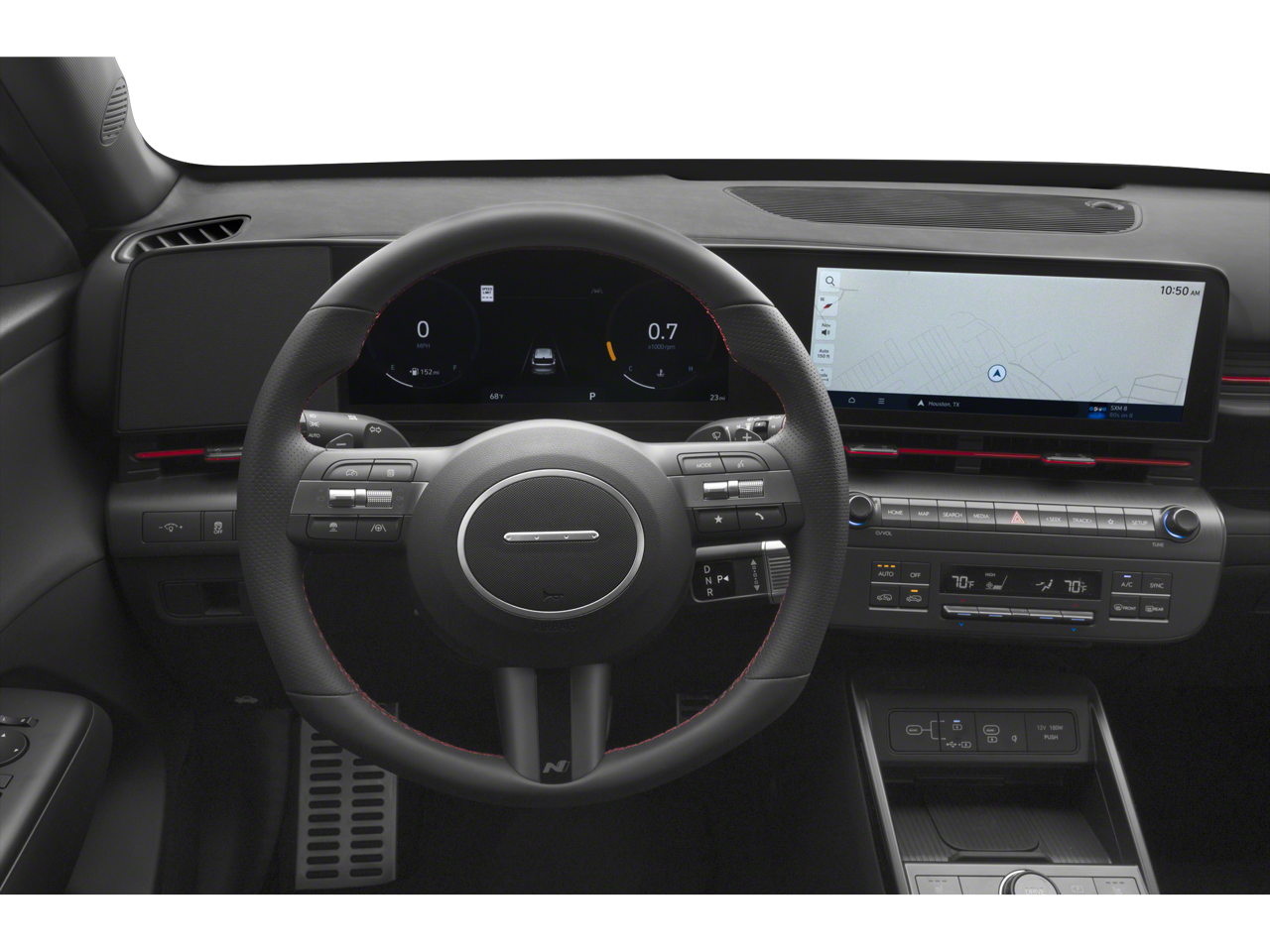 The Kona N Line's interior is a true sanctuary of comfort and convenience. Heated front sport bucket seats and a leather-wrapped steering wheel create a premium, driver-focused experience. Meanwhile, the advanced infotainment system with navigation, Apple CarPlay, and Android Auto seamlessly integrates your digital life, keeping you connected and entertained on the go.